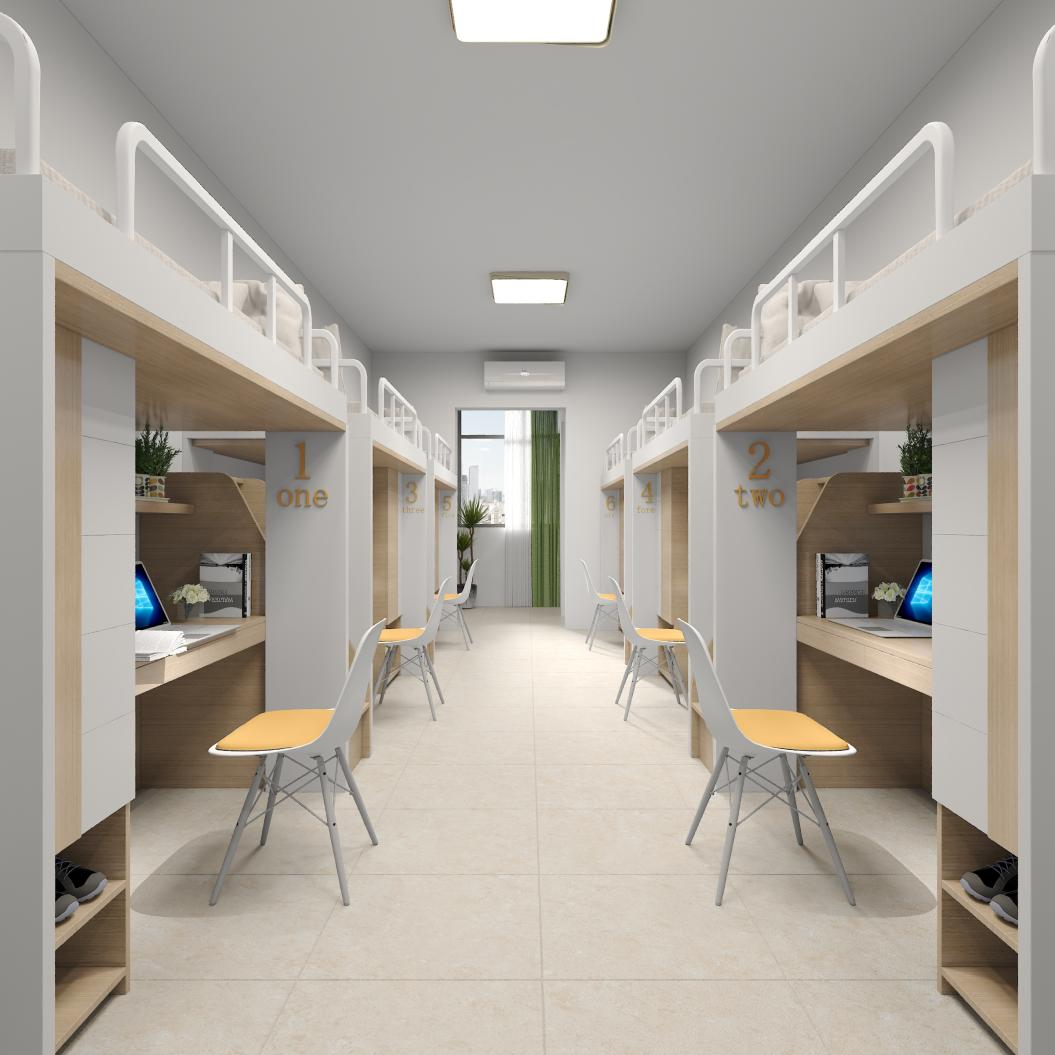 走进12号学生公寓的宿舍,宿舍内采用标准四人间布局,独立卫浴、空调、书桌、衣柜等设施一应俱全。