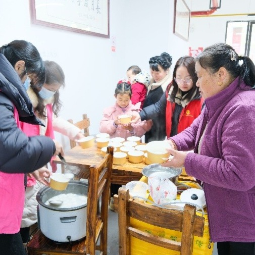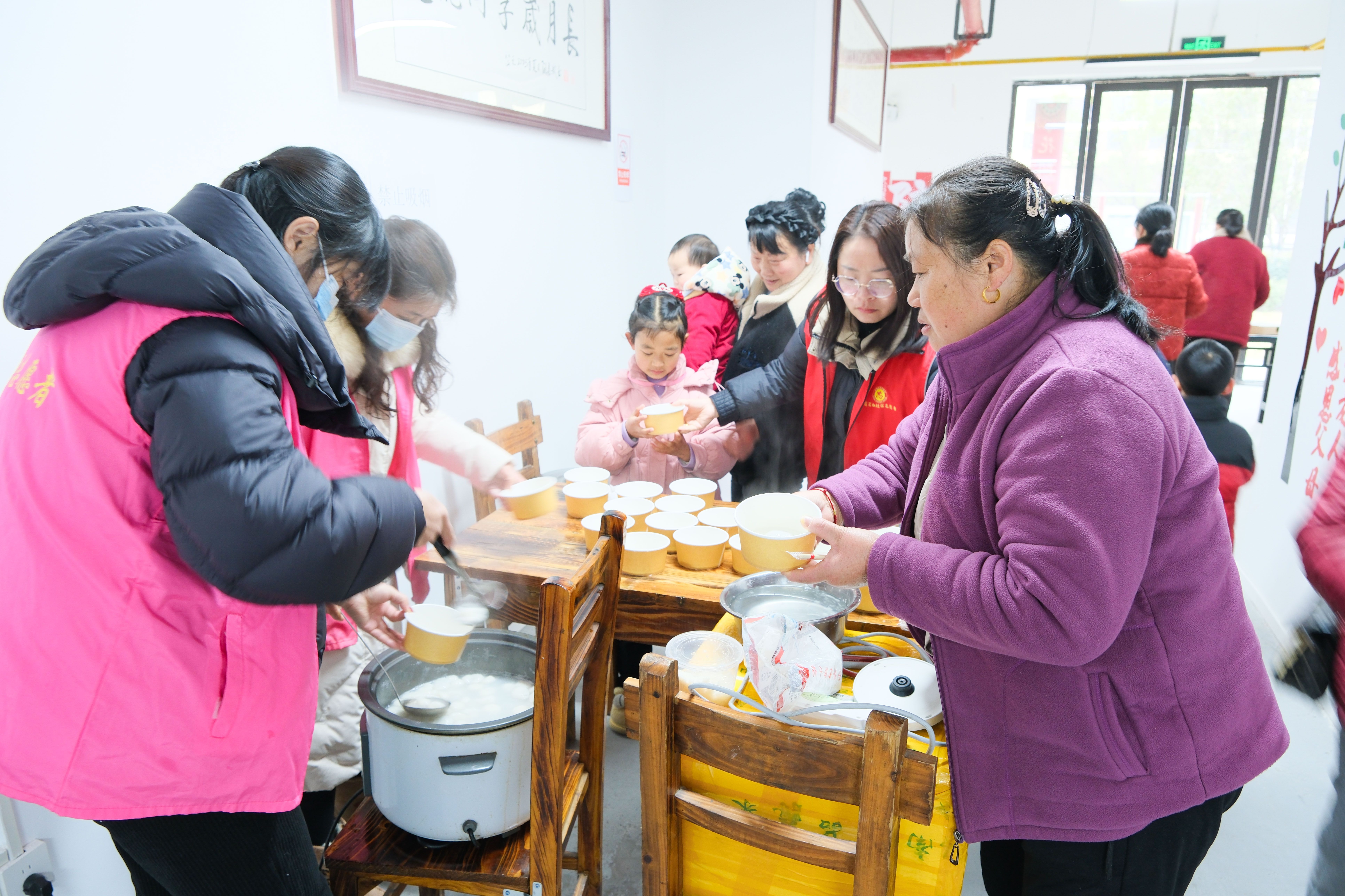 另一边的长桌上,包汤圆的热闹劲儿一点不输。阿姨们动作麻利,不一会儿,大大小小的汤圆摆满了托盘。下锅一煮,白白胖胖的汤圆在沸水里翻滚,盛出来分给大家。咬一口,黑芝麻馅儿流出来,甜糯的味道在嘴里化开。