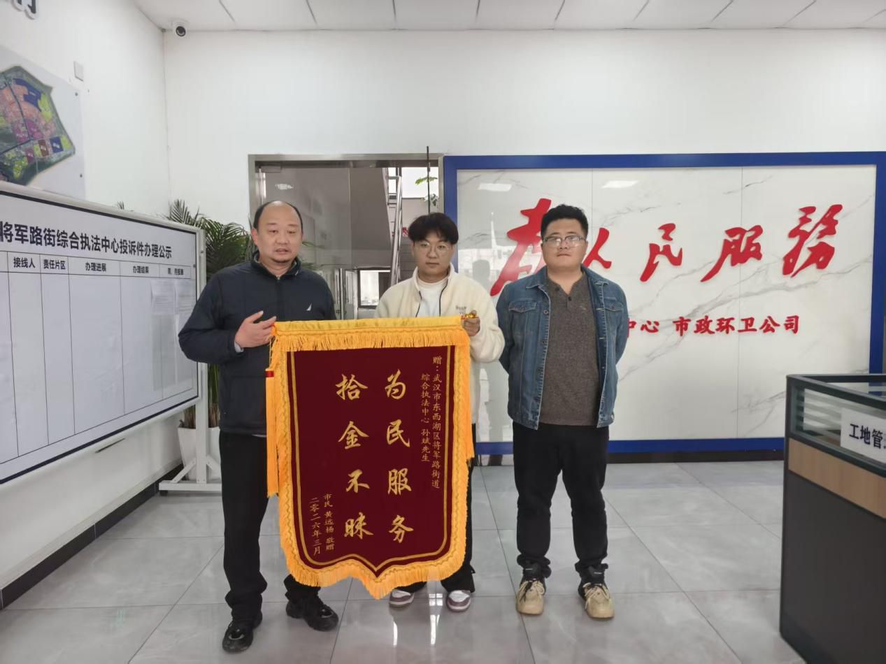 3月4日上午,居民黄先生手捧锦旗专程来到将军路街综合执法中心,向市政环卫公司员工孙斌表达谢意。锦旗上“为民服务拾金不昧”几个大字,见证了一段暖人心扉的故事。