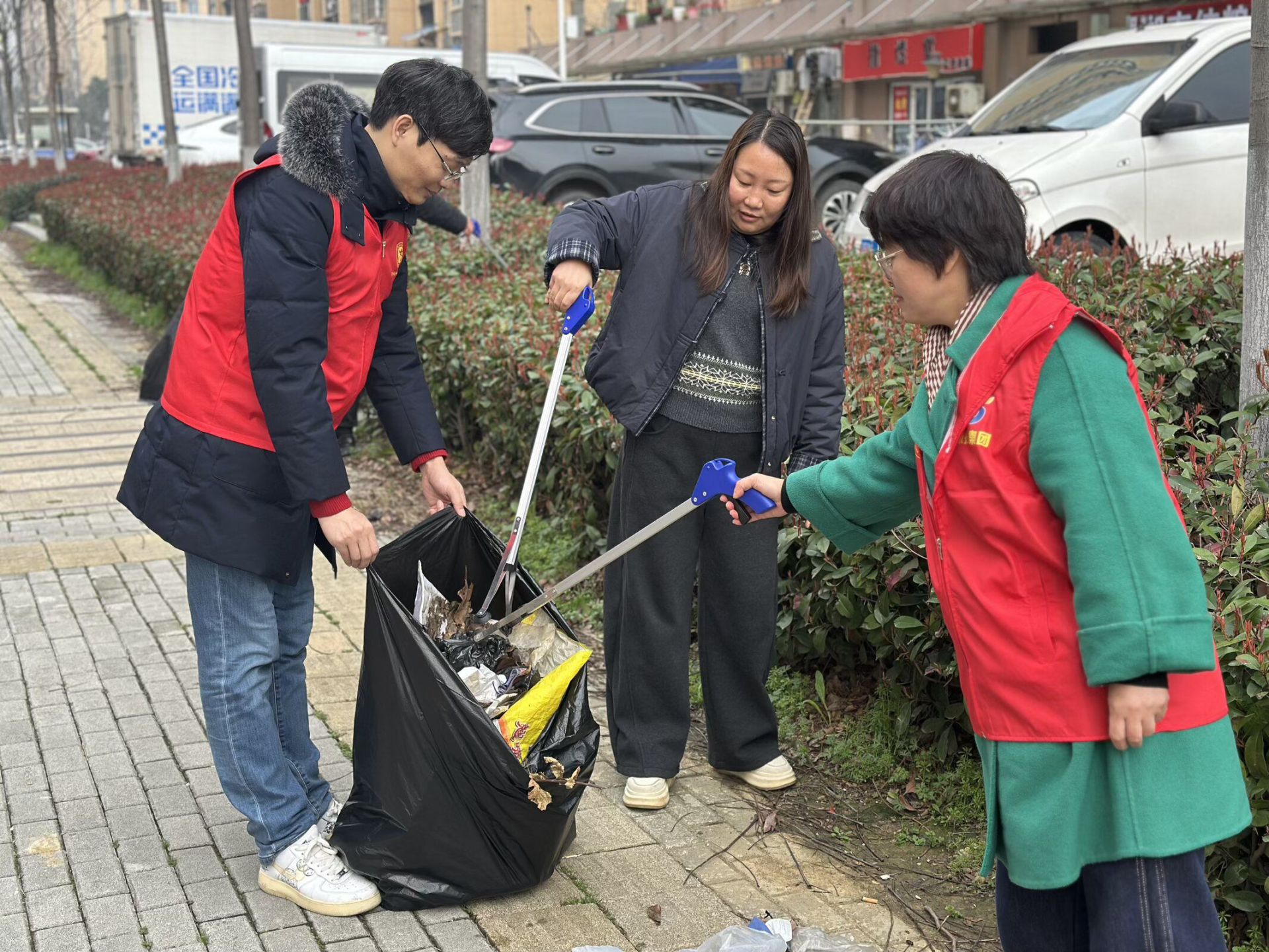 活动中,党员志愿者们身着鲜艳的“志愿红”,冲锋在前,手持清洁工具,重点对辖区道路两侧绿化带、公共区域的垃圾进行捡拾,针对白色垃圾、烟头等卫生死角进行集中清理。大家分工协作、默契配合,将党建共建活力转化为美化社区环境的强大动力。在劳动的间隙,志愿者们还化身“文明宣传员”,向过往的居民宣传文明创建、绿色环保理念,带动居民主动参与家园维护,真正形成了“党员带头干、群众齐参与”的生动局面,用实干彰显党员担当,以行动凝聚共建合力。