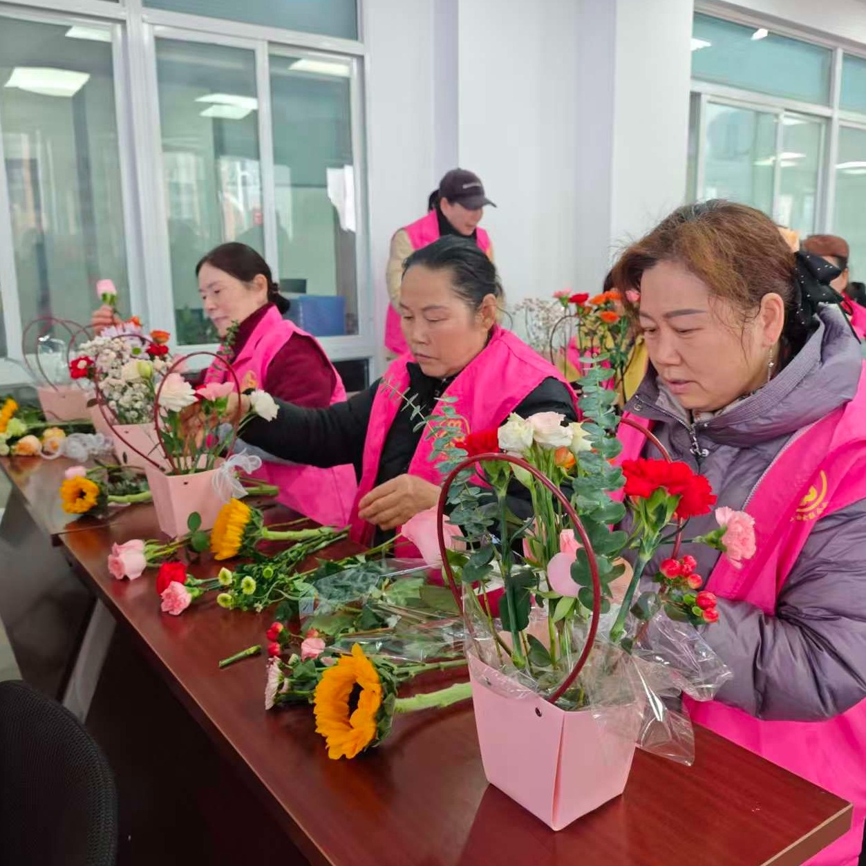 活动现场暖意融融,一束束向日葵向阳而生、生机盎然,粉嫩的康乃馨、娇艳的玫瑰点缀其间,小巧的小雏菊穿插其中,花香袅袅,满是温馨气息。