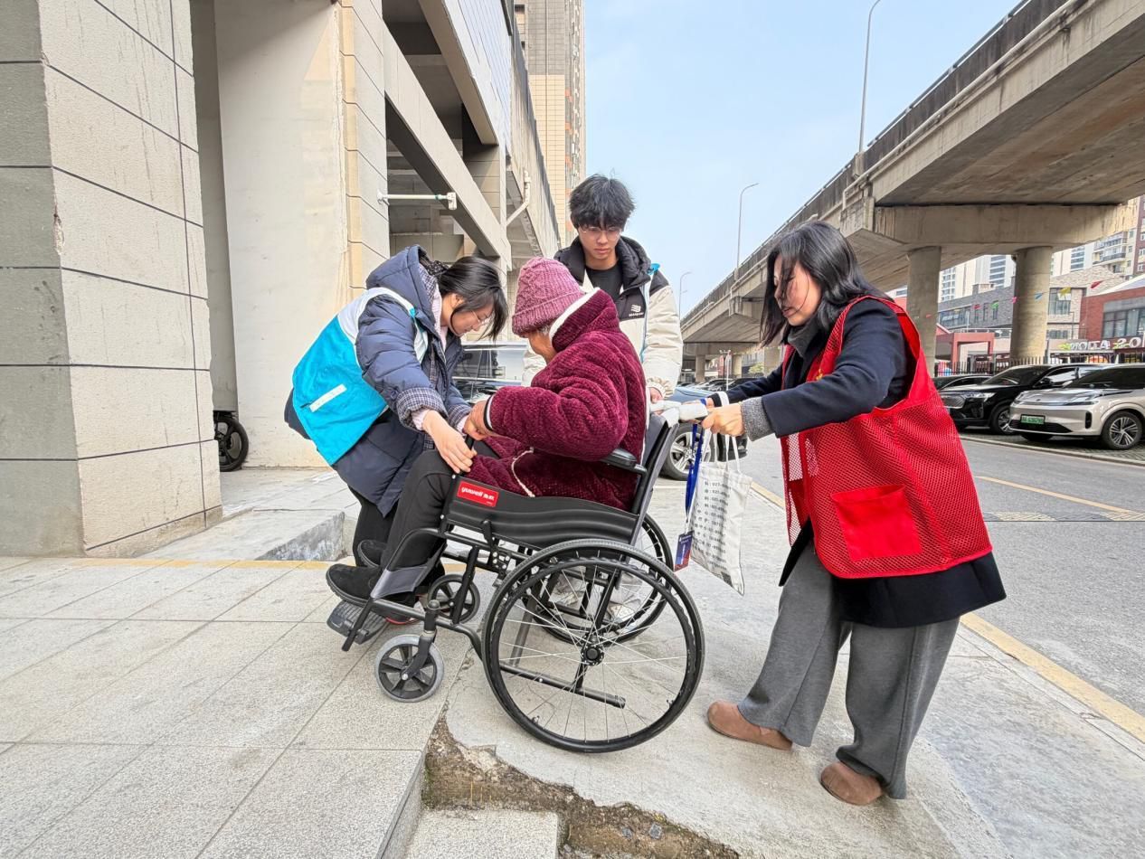 培训结束后,志愿者分组深入社区,走进20户独居、空巢及高龄老人家中,为老人提供退休年审代办服务,测量血压、血糖,建立健康监测档案。针对行动不便的老人,志愿者贴心推来轮椅,陪老人下楼散步、聊天散心。