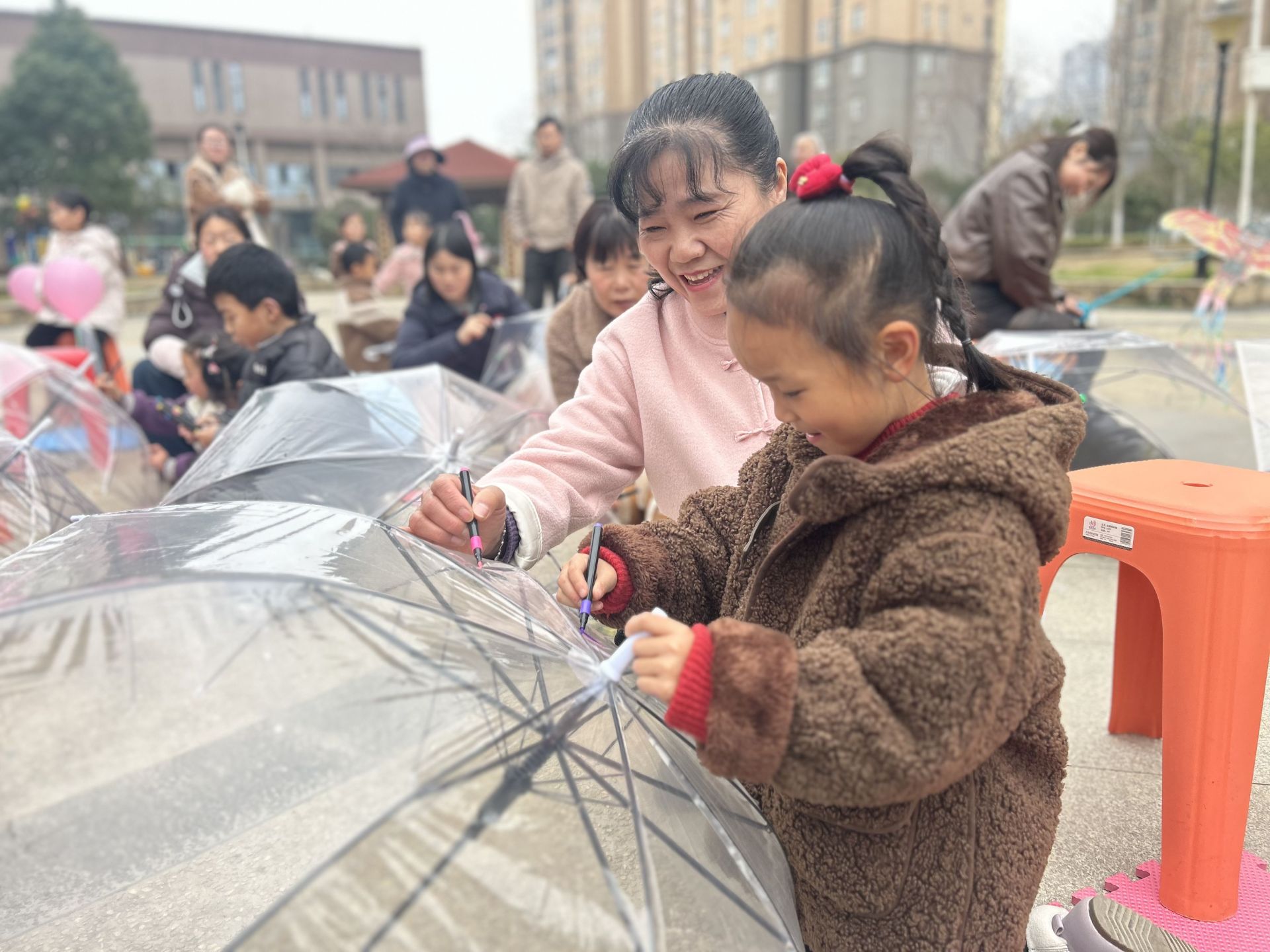 在绘画活动区,志愿者们早已准备好了画笔、颜料和透明的画布——这一次,孩子们要绘制的不是伞面,而是“春天的故事”。孩子们化身“小小艺术家”,或蹲或坐,神情专注地在画布上挥洒创意。有的画下盛开的花朵,有的描绘手牵手的全家福,还有的写下“我爱我家”的稚嫩文字。文明实践站不仅是活动的场地提供者,更是美育的传播者。志愿者老师们穿梭其中,轻声引导孩子们用画笔表达内心的感恩与对春天的向往。一幅幅五彩斑斓的画作,正如文明实践工作,用润物无声的方式,为社区生活增添了温暖而明亮的色彩。