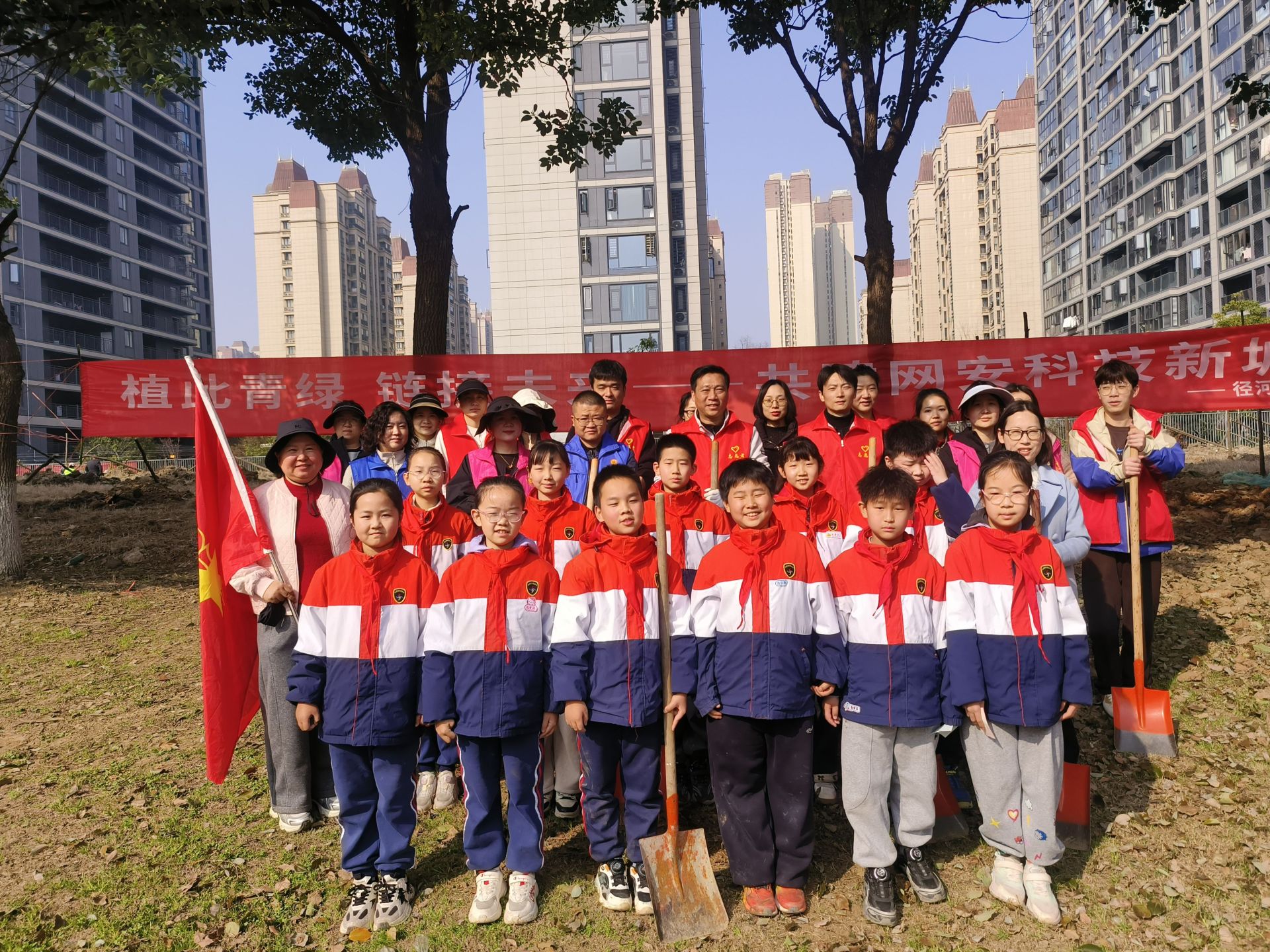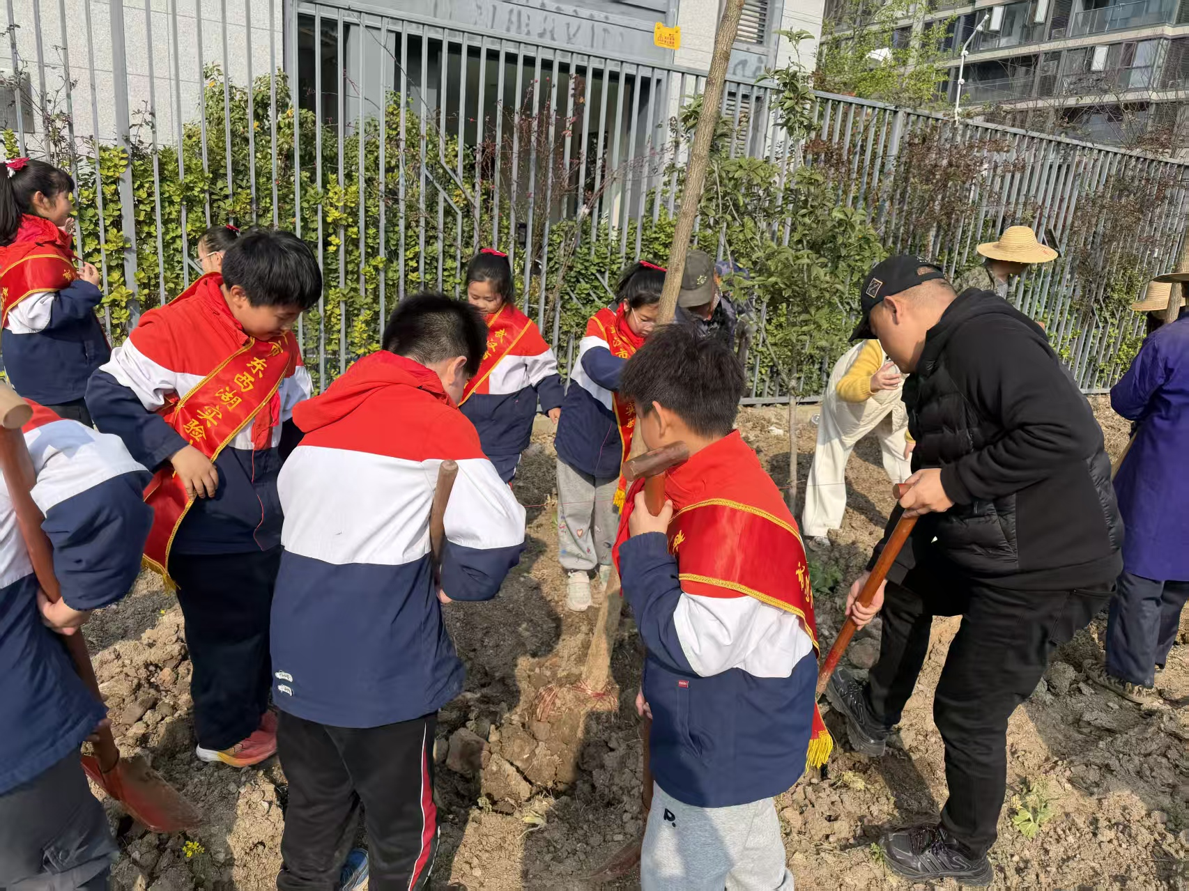 经过一个多小时的忙碌,一棵棵新栽的树迎风挺立,原本空旷的空地变得生机盎然。活动临近尾声,社区工作人员和小朋友们站成一排,在刚刚种下的树木旁合影留念。镜头定格的那一刻,大家笑得格外灿烂,身后是静待生长的树木,眼前是满怀期待的笑脸。