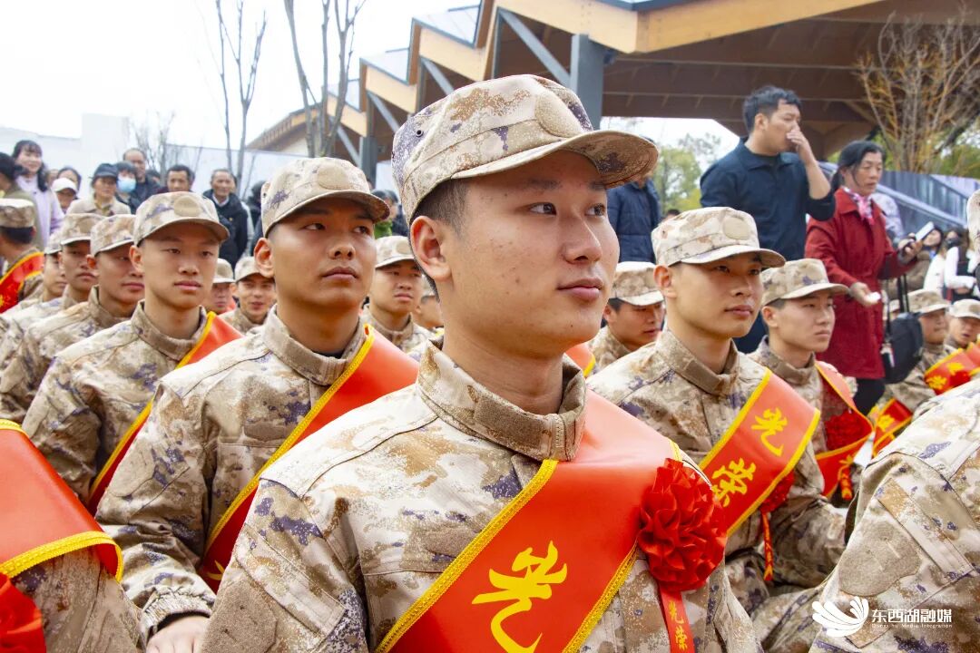 仪式现场,“参军入伍、保家卫国”“忠诚铸魂、守护人民”等标语格外醒目。子弟兵们身姿挺拔、列队整齐,他们目光坚定、精神昂扬,展现出新时代东西湖青年报效祖国的赤子之心。