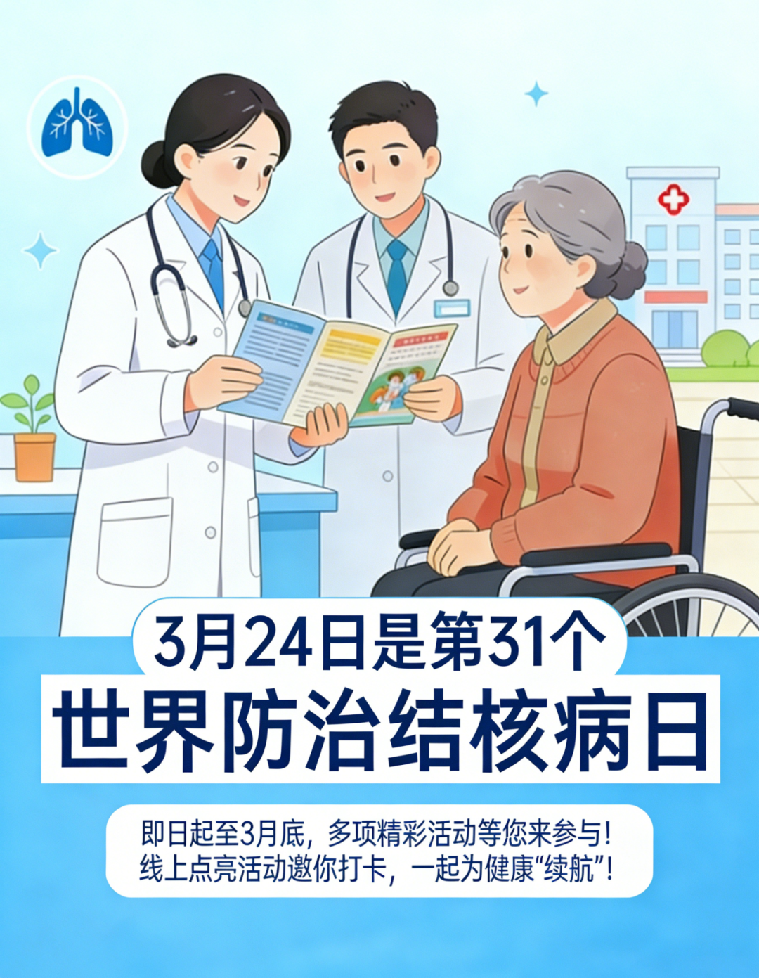 2026年3月24日是第31个“世界防治结核病日”,今年的主题是:全面行动、全力投入、全民参与、终结结核!为提升辖区居民防病意识,东西湖区结核病防治所统筹全区医疗卫生资源,精心策划了一系列形式新颖、贴近群众的主题宣传活动。即日起至3月底,多项精彩活动等您来参与!还有线上点亮活动邀你打卡,一起为健康“续航”!
