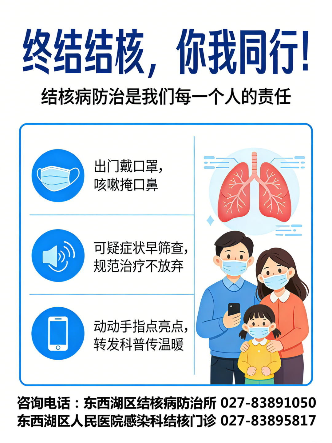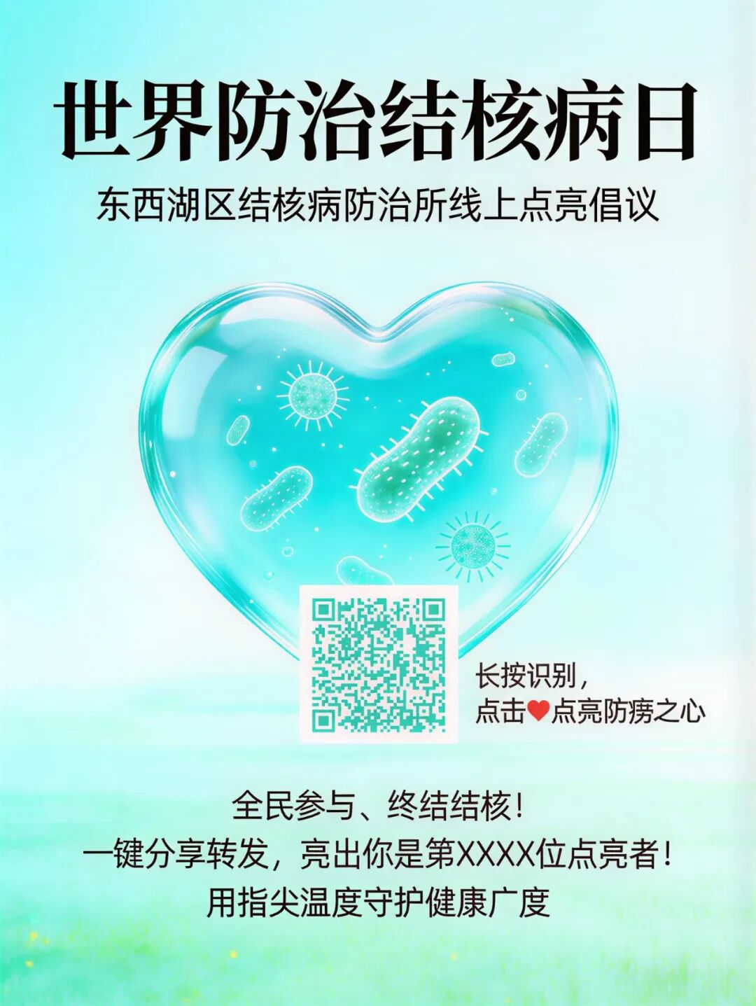 让我们一起行动起来,以微薄之力,筑健康防线,全力投入、全民参与,一起终结结核,守护自己和家人的呼吸健康!