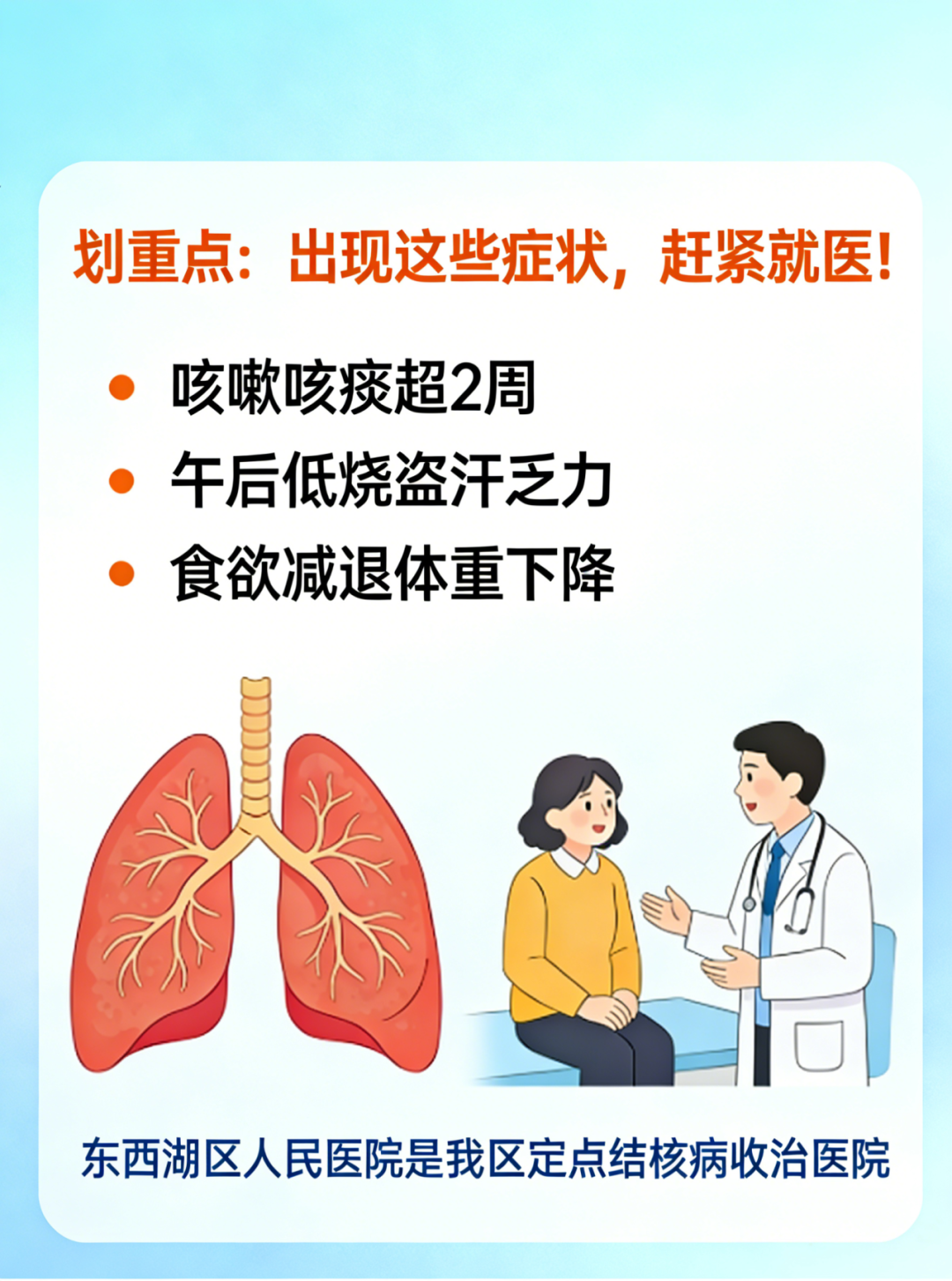 一旦出现以上症状,别拖延!赶紧去东西湖区人民医院——咱区唯一定点结核病收治医院,专业筛查、规范治疗一站式搞定,家门口就能享受到优质诊疗服务,不用跑冤枉路!