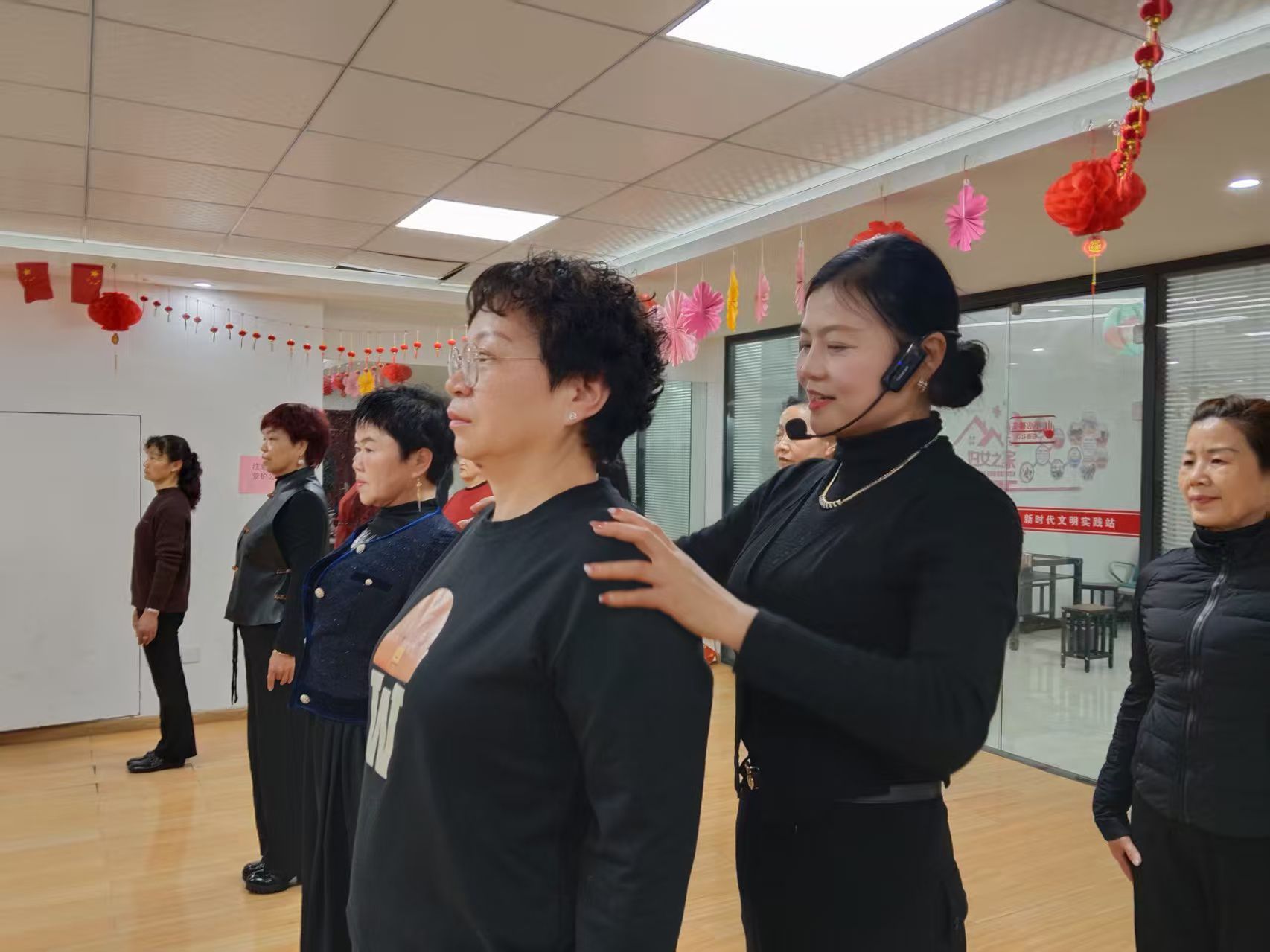 课程伊始,胡老师先带领学员开展肩颈拉伸、脚踝活动等简易热身,帮助大家放松身体、活动关节,为后续训练打好基础。紧接着,老师围绕站姿、走姿、摆臂等基础动作细致教学,一边示范“挺胸收腹、肩膀下沉、眼神平视”的核心要领,一边穿梭在队伍中,手把手纠正动作、调整姿态,耐心解答各类疑问。