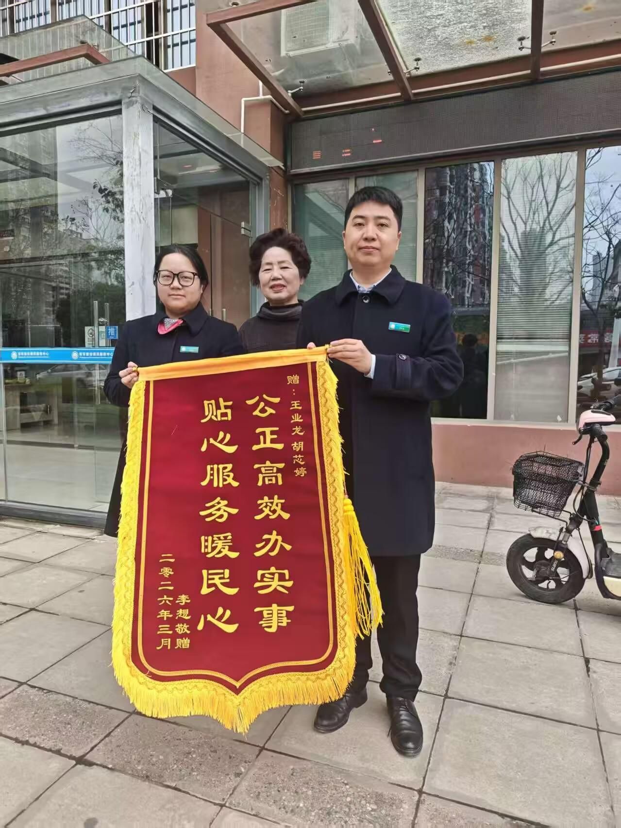 “我经常来个体窗口办事,每次工作人员都非常热情,特别是小胡和小王,政策解释得清清楚楚,填表也帮我核对仔细,每次都顺顺利利把事办成。”王女士感慨,“我几次想买点东西表达心意都被坚决拒绝了。这份心意一直记在心里,今天特意送来锦旗,真心感谢她们!”