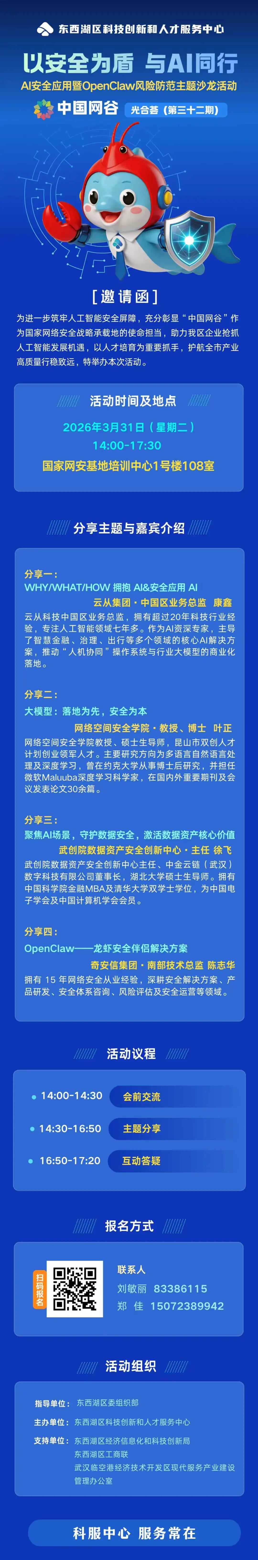 3月31日下午,由东西湖区委组织部指导,东西湖区科技创新和人才服务中心主办的“中国网谷·光合荟(第三十二期)”——“AI安全应用暨OpenClaw风险防范主题沙龙”,将在国家网络安全人才与创新基地重磅开启。