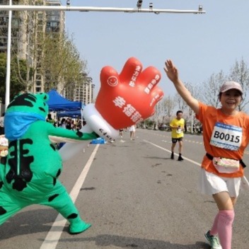 10公里处正是跑者体力消耗较大的关键节点,稻香社区精心筹备的助威点位格外暖心又亮眼。两名身着可爱加油蛙服饰的志愿者化身活力使者,蹦跳着向过往跑者挥手致意,呆萌的造型瞬间驱散选手疲惫感。不少跑者笑着挥手回应,脚步都变得轻快起来。