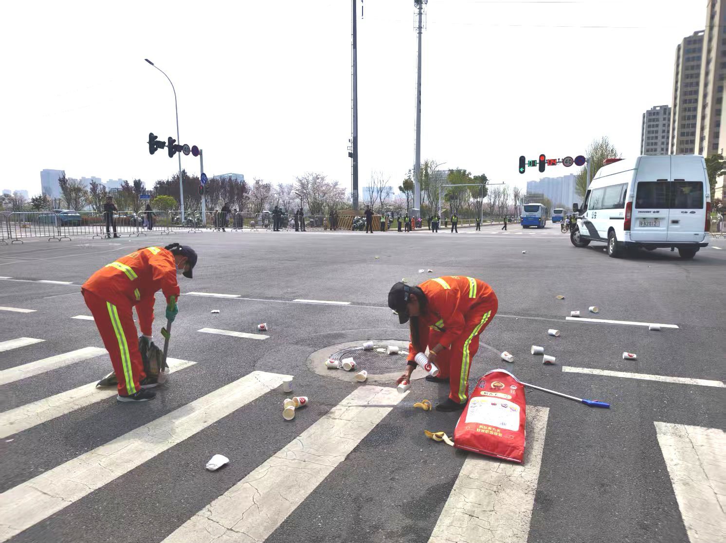 赛事一结束,环卫工作人员便第一时间奔赴各自负责区域,迅速开启“高效清场模式”。作业过程中,环卫工人分工协作、默契配合,采取人工捡拾+机械清扫联动作业的方式,对赛道全程、周边人行道、绿化带及公共区域进行拉网式、无死角清理。大家手持扫帚、夹子、垃圾袋等工具,弯腰细致捡拾地面垃圾,将散落的杂物逐一归集;同时,洗扫车、高压冲洗车等环卫机械设备同步跟进,对路面进行全面冲洗、深度清扫,快速清除路面污渍、尘土,还原道路本色,确保道路标线清晰、路面整洁干爽。