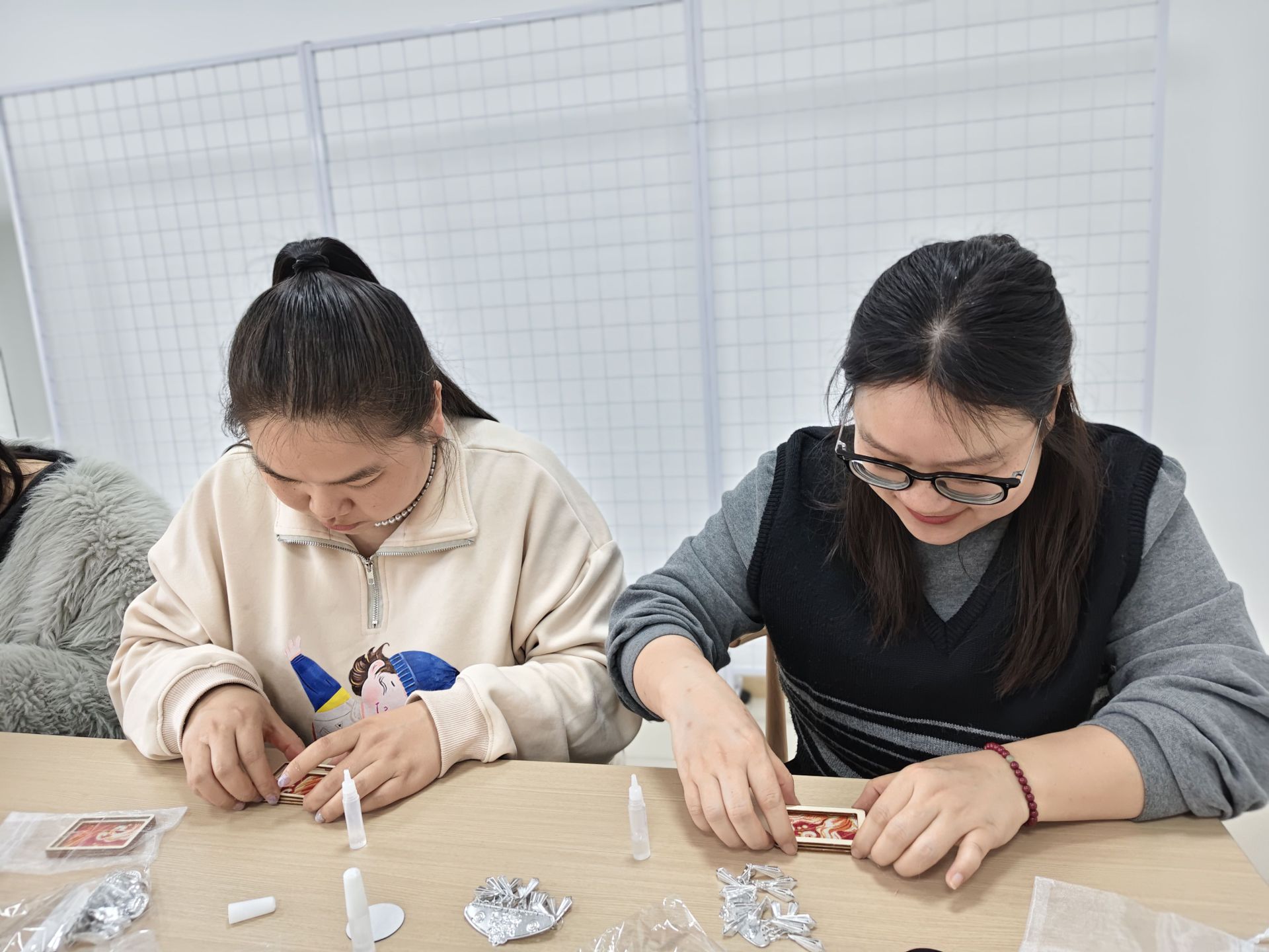 活动室内,心理志愿者早早将苗银片、磁铁、小锤等制作材料整齐摆放,首先带领大家进行简单的放松冥想,引导大家暂时放下手头繁杂的工作与琐事,静下心来感受手工制作的乐趣。随后,志愿者细致讲解了苗银这一非遗技艺的历史渊源、文化内涵与冰箱贴的制作技巧,从纹样选择、力道把控到银片固定、成品组装,每一个步骤都耐心示范、逐一指导,让大家快速掌握制作要领。社区工作者与宝妈们围坐在一起,手持小锤轻轻敲击,将一片片精致的苗银纹样慢慢雕琢成型。大家全神贯注,时而细心打磨银片边缘,时而精心搭配吉祥纹样,现场不时传来相互交流技巧、分享创作心得的欢声笑语。在一敲一打、一粘一贴中,宝妈们慢慢沉浸在手作的宁静里,原本冰冷的银片在指尖赋予温度与心意,渐渐变成了一枚枚独具特色的非遗冰箱贴。没有刻板的标准,每一件作品都独一无二,承载着制作者的巧思与情感。