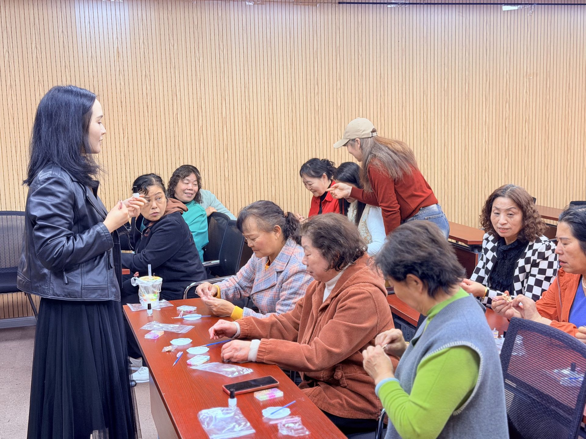 健身结束后,非遗螺钿手工课堂正式开启。老师从螺钿技艺的千年渊源讲起,细致讲解材料特性与制作流程,并现场示范粘贴、上胶等技巧。居民们聚精会神地聆听,随后纷纷挑选心仪的贝壳碎片,开始构思创作。一片片流光溢彩的螺钿在指尖流转,大家耐心镶嵌、细致打磨,不时互相交流、切磋技艺。活动现场暖意融融,欢声笑语不断。“以前只在博物馆里见过螺钿,没想到今天自己也能亲手做一件,真是太有意义了!”一位居民感慨道。在匠心传承中,大家不仅完成了一件件精美的作品,也悄然拉近了彼此的距离。