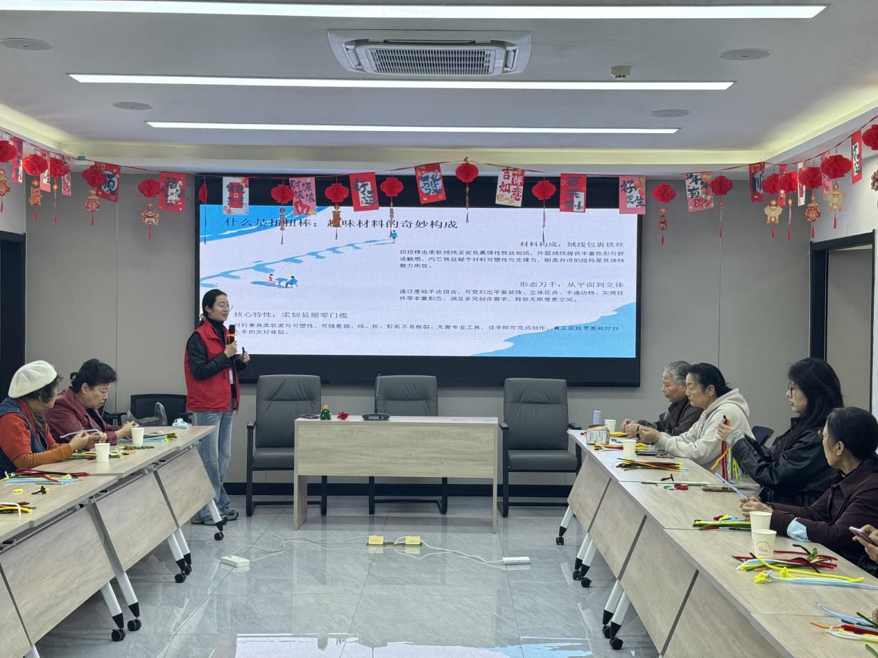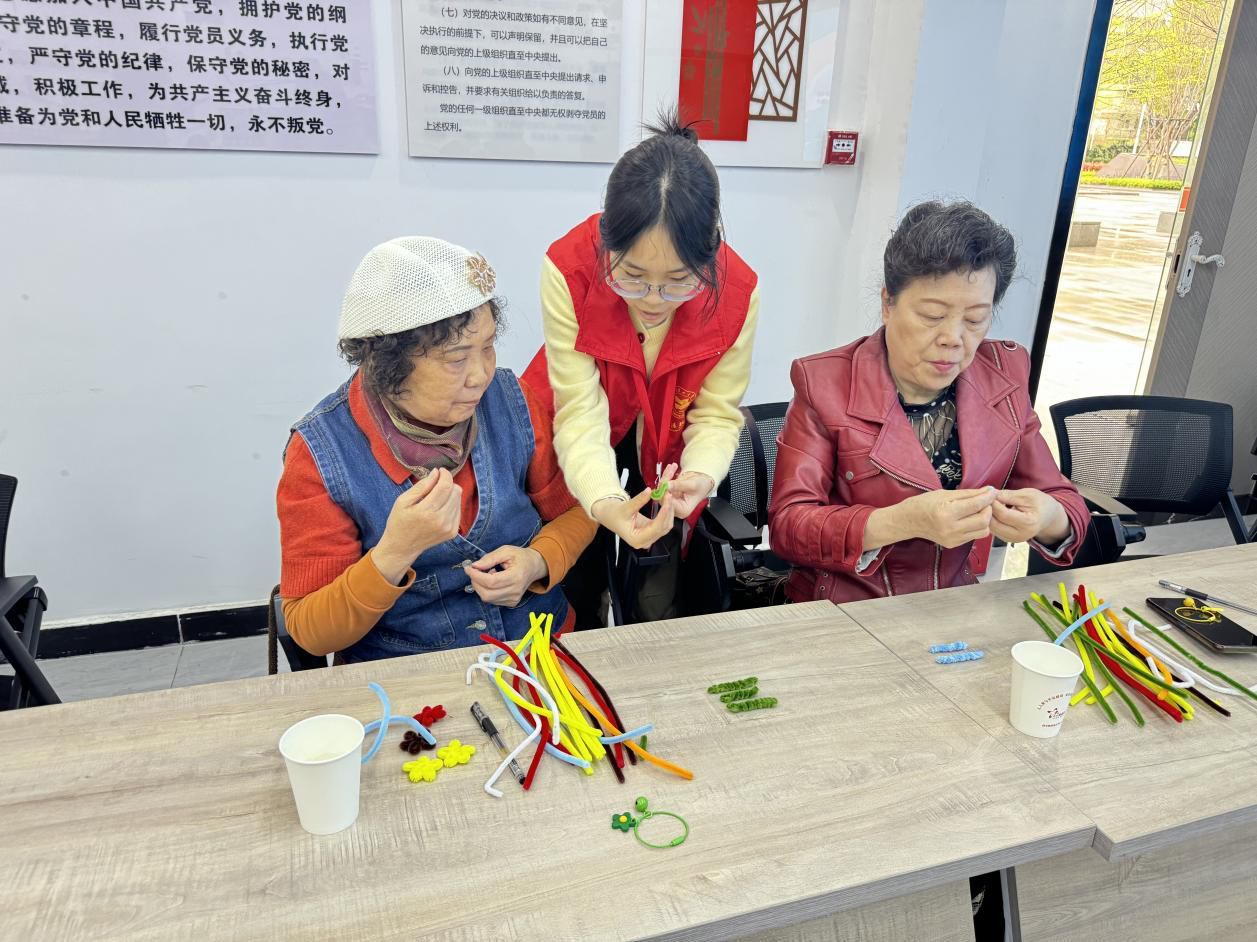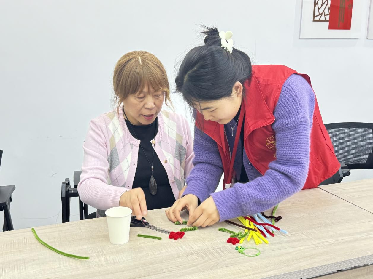 在手工制作环节,志愿者分步演示扭扭棒“春”字骨架搭建、彩色装饰花制作技巧,耐心指导大家动手创作。在一对一协助下,老人们认真弯折、缠绕、拼接,将嫩绿扭扭棒与缤纷绒花巧妙结合,一个个造型别致、春意盎然的“春”字挂坠陆续成型,看着自己亲手完成的作品,大家都很有成就感,纷纷感慨:“跟着志愿者们做手工,既动手又动脑,真的蛮有意思的。”