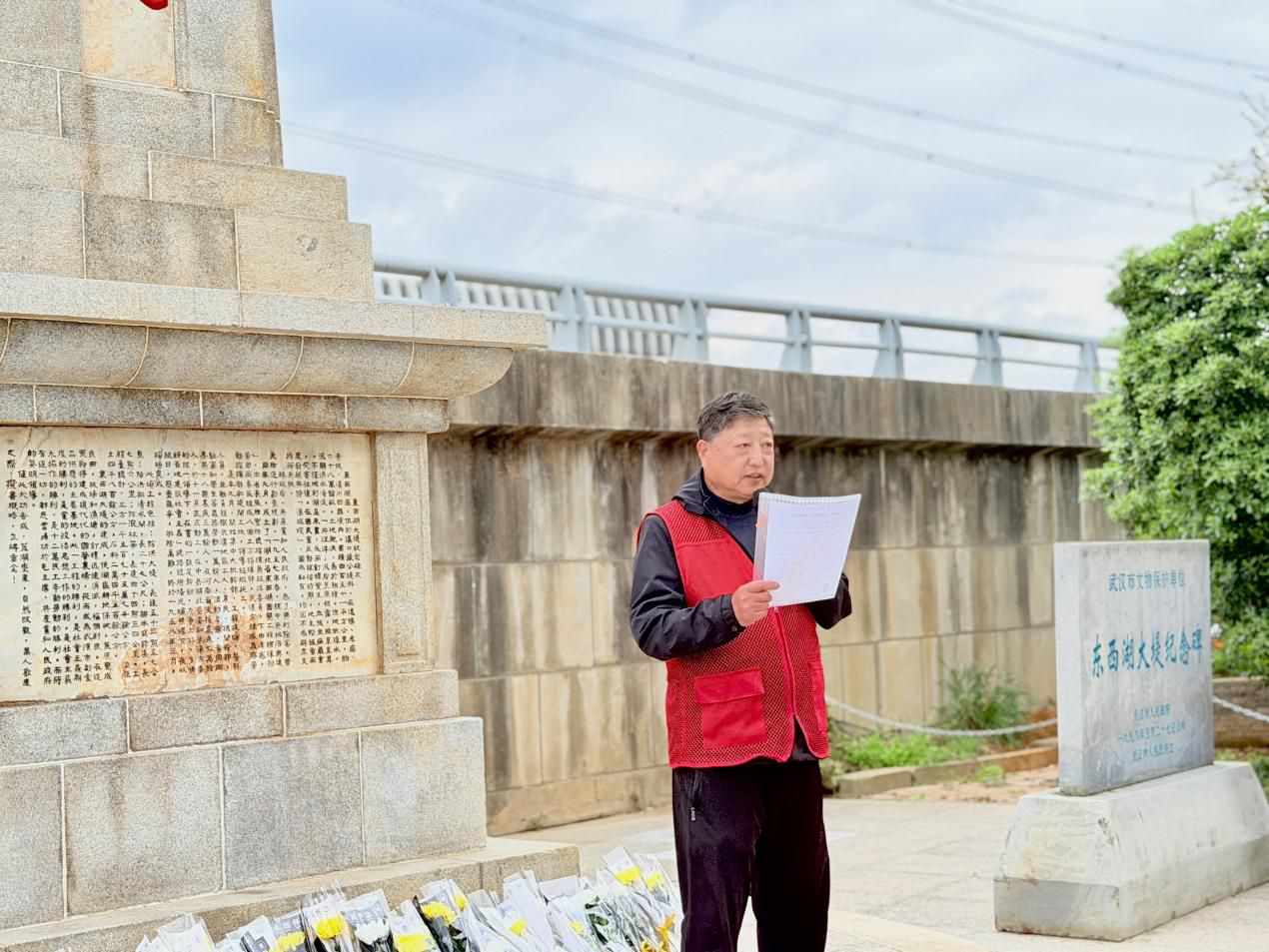 在东西湖围垦纪念碑前,一场庄重而肃穆的缅怀仪式拉开帷幕。全体师生齐声高唱《我们是共产主义接班人》,嘹亮的队歌在堤畔回荡,表达着继承先辈遗志的决心。随后,学生代表缓步上前,向纪念碑敬献鲜花,全体人员默哀致敬,深切缅怀为围垦事业献出青春与汗水的围垦先辈。