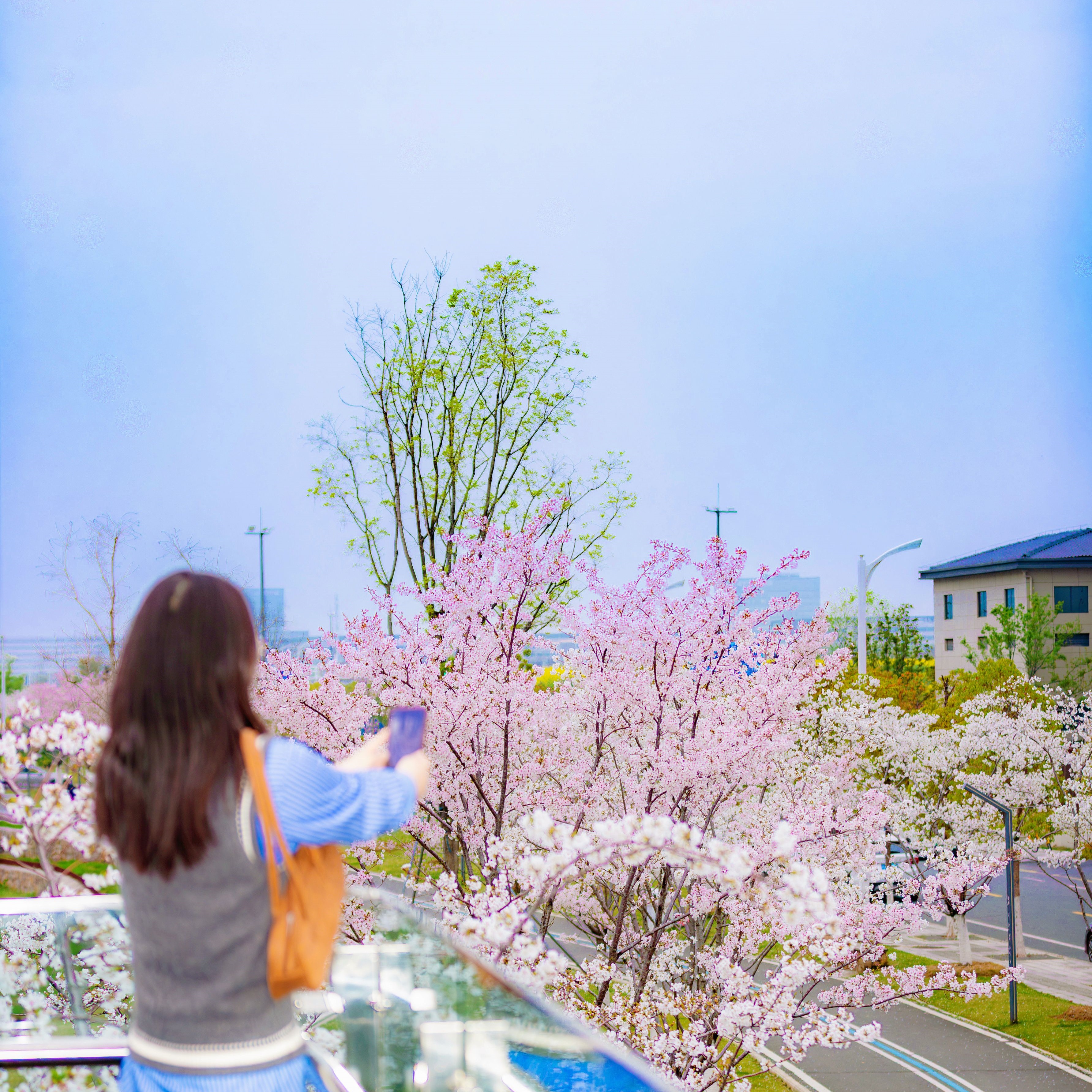 从樱花溪步行就能到临空港文化中心,这片凭借纯白建筑群和干净几何线条出圈的空间,早就是社交平台上的热门打卡地。整片建筑依缓坡舒展,大面积落地玻璃在晴日里捕捉光影流动,一步一景,随手就能拍出氛围感大片。“刷到好多博主发这里,早就想来拍一组生日写真——今天自己来了,真的超出片!”刚换完拍摄场景的大学生林晓擦着汗告诉记者。