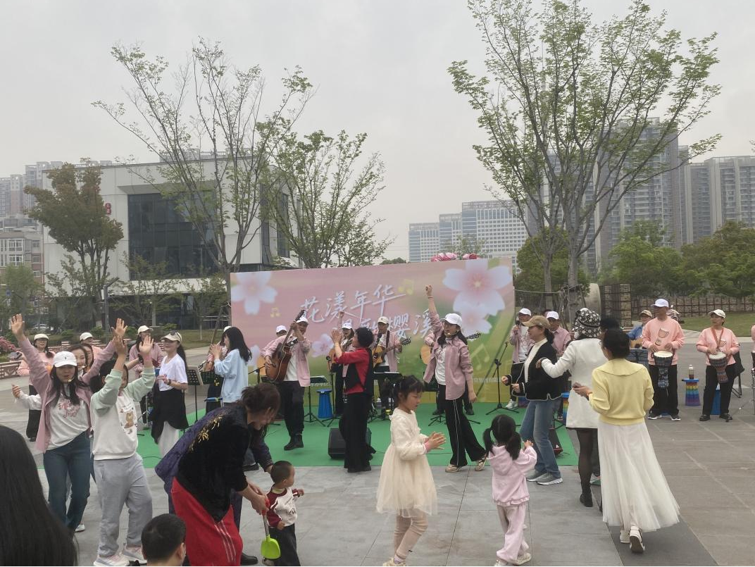 樱花溪畔,粉白花瓣随风轻舞,舞台与春日盛景相融,氛围感拉满。常青花园湖之韵民谣队在此倾情献艺,温柔治愈的《萱草花》、激昂洒脱的《我们的时光》、清新温暖的《稻香》等经典民谣曲目接连上演,吉他轻弹、手鼓律动,歌声与春风、花香交织相融。演出现场,观众们沉浸其中,欢快的歌曲响起,大家纷纷挥手打节拍,笑容洋溢;舒缓的旋律流淌时,又闭眼轻摇,静静品味民谣韵味,与公园樱花盛放的景象融合成美好画面。当最后一首《张三的歌》响起,气氛瞬间推向高潮,市民们自发起身,手拉手围成圈,在樱花树下踏歌起舞,欢声笑语不断,其乐融融,完美呈现“花下听歌,歌中赏花”的惬意,春日的温暖与欢乐在樱花溪畔肆意蔓延。