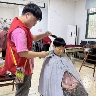理发的间隙,志愿者不时问一句“这里要不要再短些”“耳朵旁边这样行不行”,手上的活一直没停。老人们也放松下来,聊几句最近的身体,说说家里的琐事,服务站的空气里满是轻声细语和剪刀咔嚓的声响。