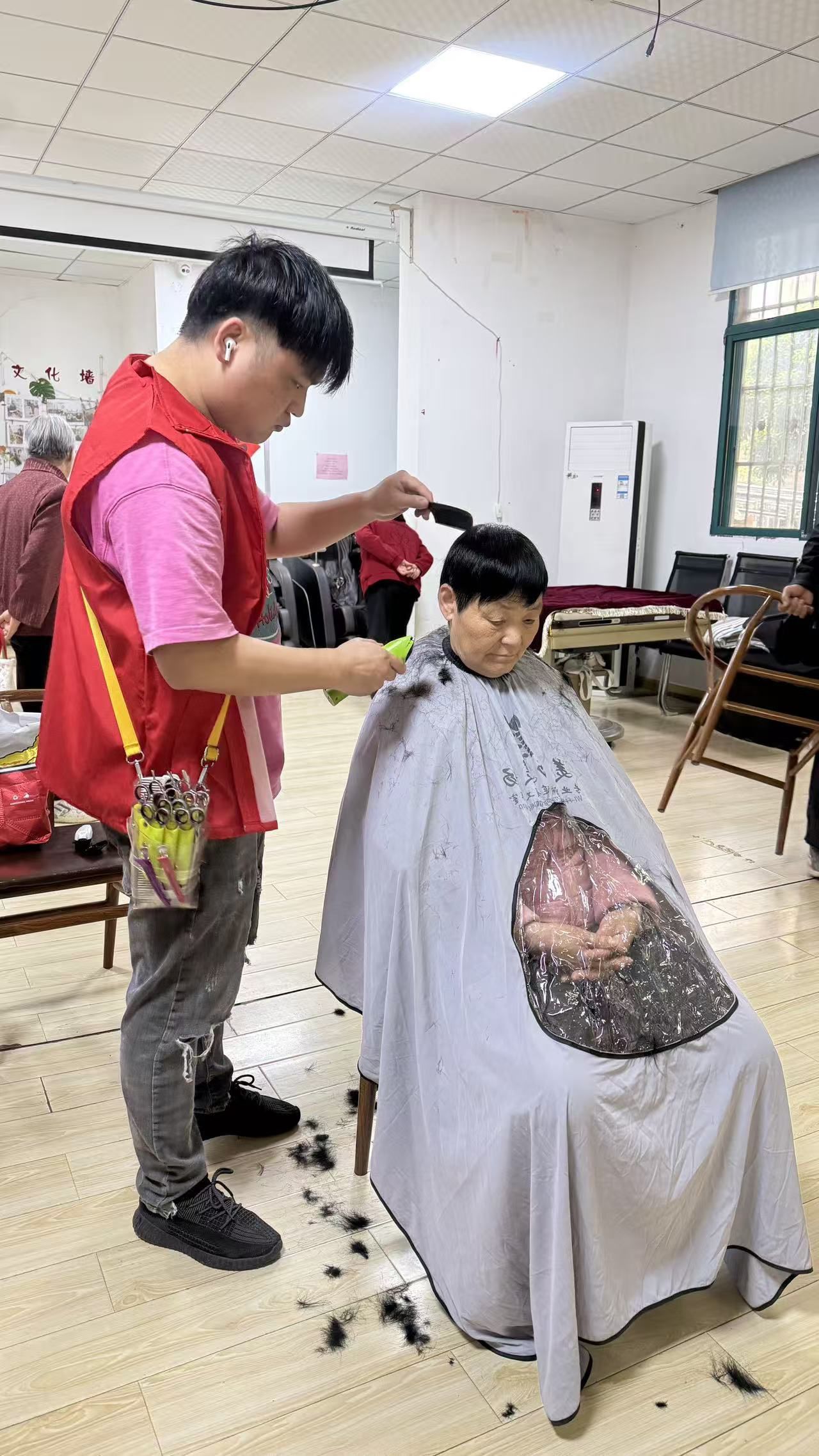 当天上午,阳光正好,老人们三三两两结伴而来。一进门,志愿者就迎上去帮忙拉开椅子、递上围布,问清楚想要的样子——是修短一点,还是把后面推齐,鬓角留多长。剪刀在发间细细走过,碎发簌簌落下,不一会儿,原本有些凌乱的头发变得清爽利落。一位大爷理完对着小镜子端详了好一会儿,嘴角慢慢翘起来,新的发型也带来了新的心情。