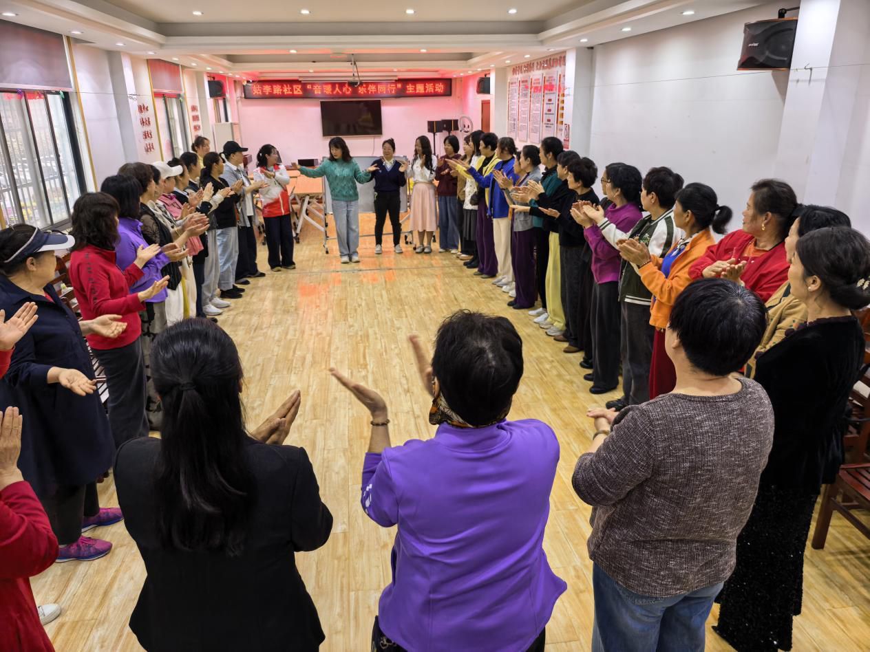 伴随着轻柔舒缓、悠扬动听的音乐,现场氛围逐渐变得轻松惬意。在老师的悉心引导下,大家纷纷放下拘谨,跟随音乐的节奏舒展身体、轻扬舞步,时而抬手轻摆,时而转身踏步,动作随性自然。邻里间相互配合、默契互动,欢声笑语在活动现场久久回荡。