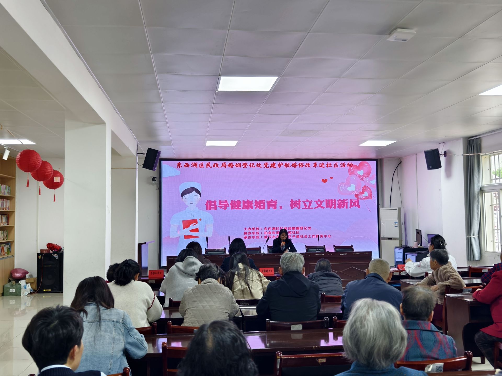 4月20 日下午,东西湖区民政局婚姻登记处联合柏泉街道新港苑社区居委会、区妇幼保健院、区婚姻家庭纠纷人民调解委员会及东西湖区予童社会工作服务中心,在新港苑社区居委会举办“倡导健康婚育,树立文明新风”文明婚俗宣传进社区活动。活动吸引辖区适龄青年、新婚夫妇、备孕家庭及广大居民踊跃参与,现场氛围热烈、互动频繁。