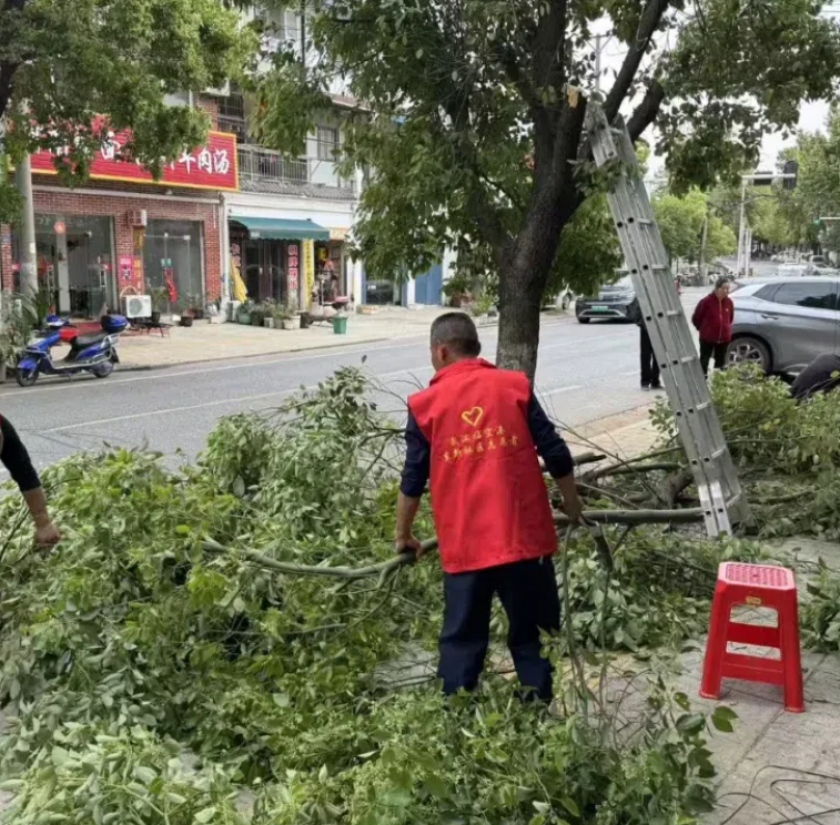 完成消杀工作后,志愿服务队前往沿街商铺片区,针对商户反映的树木遮光、招牌遮挡问题进行整治。辖区内部分樟树生长过于繁茂,不仅遮挡商铺采光与门头招牌,影响商户正常经营,还存在枯枝掉落安全隐患。志愿者们在与商户充分沟通后,有序开展树木修剪工作,架梯、锯枝、清理、清运一气呵成,为树木进行精准“整形”。