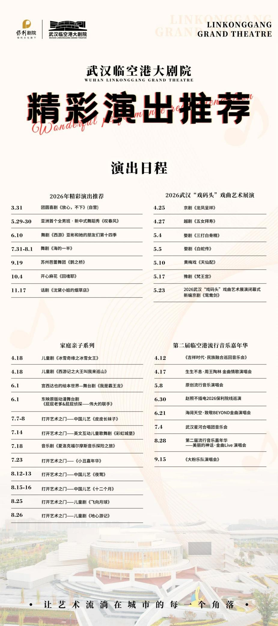武汉临空港大剧院负责人樊鑫介绍,临空港文化中心每年安排演出不低于80场,涵盖新春汇演、儿童剧展演、音乐嘉年华等多元品类。4月24日至5月23日,2026武汉“戏码头”戏曲艺术展演将走进武汉临空港大剧院,京剧、越剧、婺剧、黄梅戏、豫剧五大剧种轮番登场。【(福利)五大剧种七场好戏,七位梅花奖得主亮相东西湖!】