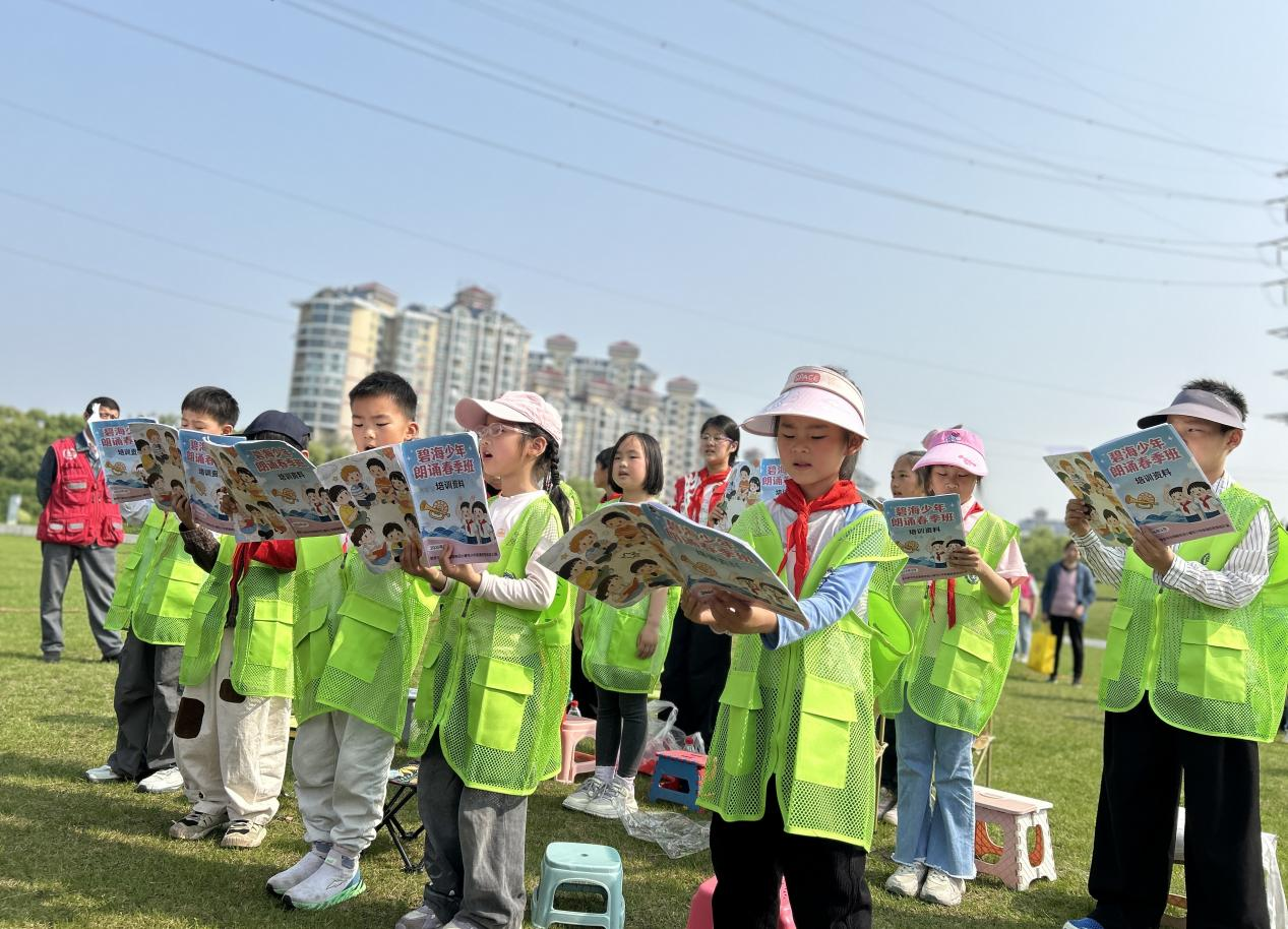 “1979年,那是一个春天……”在碧海小螺号朗诵班宋颂老师的带领下,孩子们身着亮眼的绿马甲,在蓝天绿草间集体诵读《春天的故事》。稚嫩的童声与春日美景交相辉映,传递着对祖国的热爱。