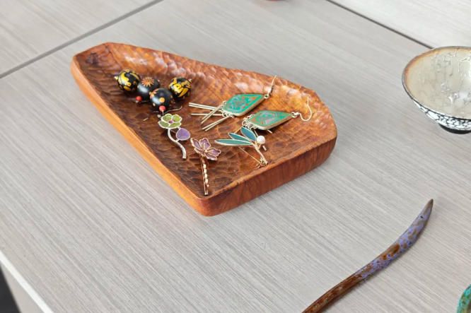 展陈之中,多款手镯尤为吸睛,器物通体温润泛光,光影之下尽显金缮般细腻肌理。其表层并非普通漆料,而是采用天然大漆,经反复髹涂、精细打磨、悉心推光匠心制成。不少游客循着淡淡漆香驻足端详,凝视深邃莹润的漆面,温润光泽直抵心底,仿佛跨越岁月长河,真切触摸到传统匠人指尖留存的匠心与温度。