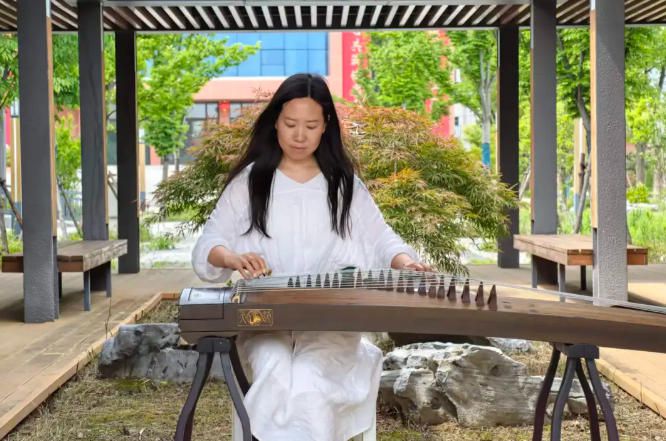 步入一楼大厅,悠扬婉转的古筝清音悠然萦绕耳畔。一位青年女子端坐琴前,指尖轻拢慢捻、从容拨弦,淙淙琴音清澈灵动,涤尽尘喧,为整个空间平添雅致韵味。