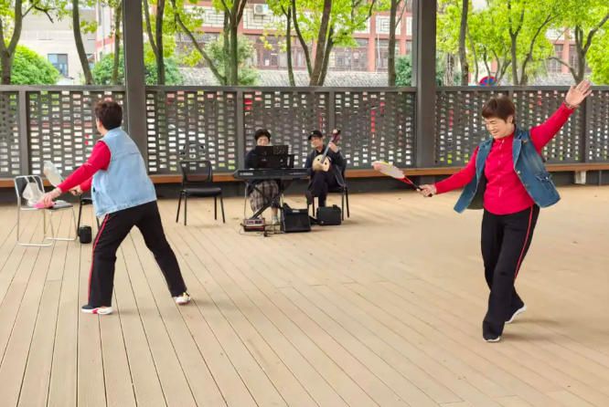 移步向内,三位神采矍铄的长者现场展演太极功法,身姿舒缓飘逸、气韵行云流水。其中一位老者尤为引人注目,手持太极柔力球拍,招式开合流转、翻腕转臂之间,拍面之上的小球始终平稳滚动、不曾坠落,仿佛被一股温润内力稳稳托举,精妙场面引得在场观者连连赞叹、驻足欣赏。