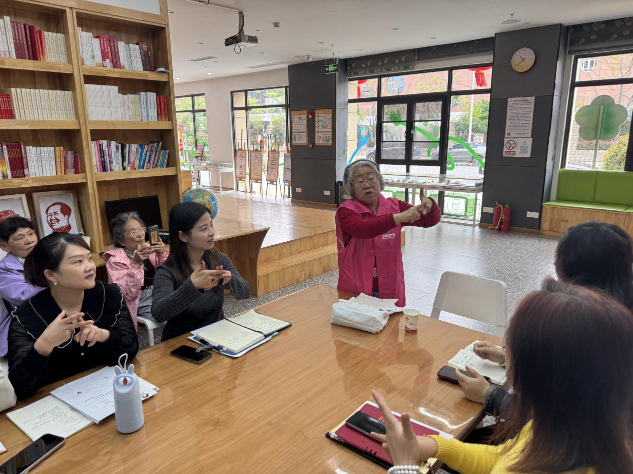 为进一步丰富读书月内涵,社区创新推出 “阅读 + 公益” 特色活动,特别邀请辖区特殊学校退休老教师刘祖玲开展手语教学课堂。课堂上,刘老师用通俗易懂的方式拆解手语动作,耐心指导社区工作人员和志愿者学习基础手语,帮助大家掌握与听障人士沟通的基本技能。大家纷纷表示,学好手语不仅是一项新技能,更能在今后工作中更好地服务特殊群体,及时回应居民需求。此次活动以阅读为纽带,以公益为底色,为构建包容友善、互助和谐的社区环境打下坚实基础。
