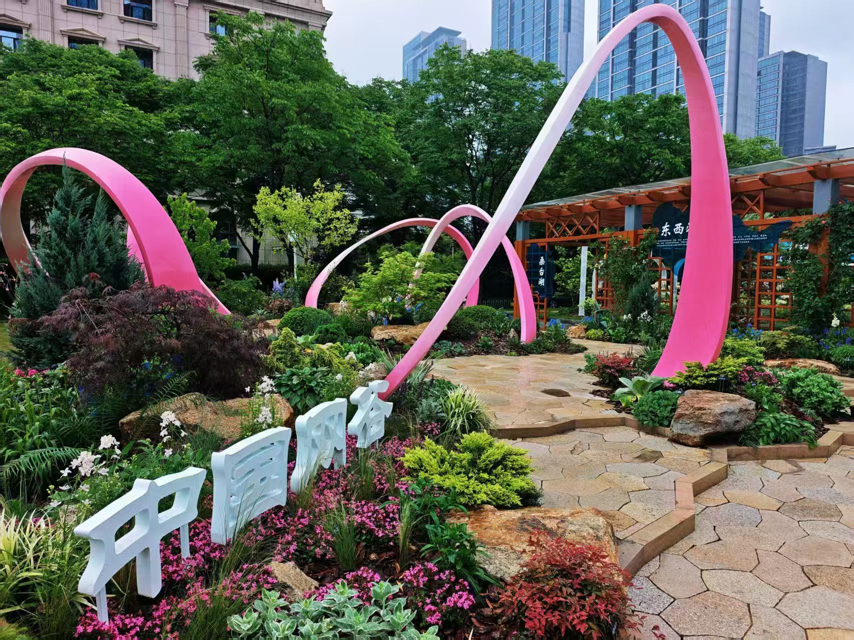 景观设计别具匠心,以冷色调蓝绿植物与岩石植物为基底,搭配现代粉色花瓣造型构筑,宛若岩石繁花悄然绽放。飘逸渐变色花瓣飘带交织网状线条,巧妙呼应“中国网谷”产业名片;南侧廊架打造立体花墙,融入桑台湖、绿野湖等本土地名典故,让生态景观与城市文化深度交融。园内植物均配置讲解标牌,市民可游可赏、寓学于乐,在赏花观景中感受东西湖的独特魅力。