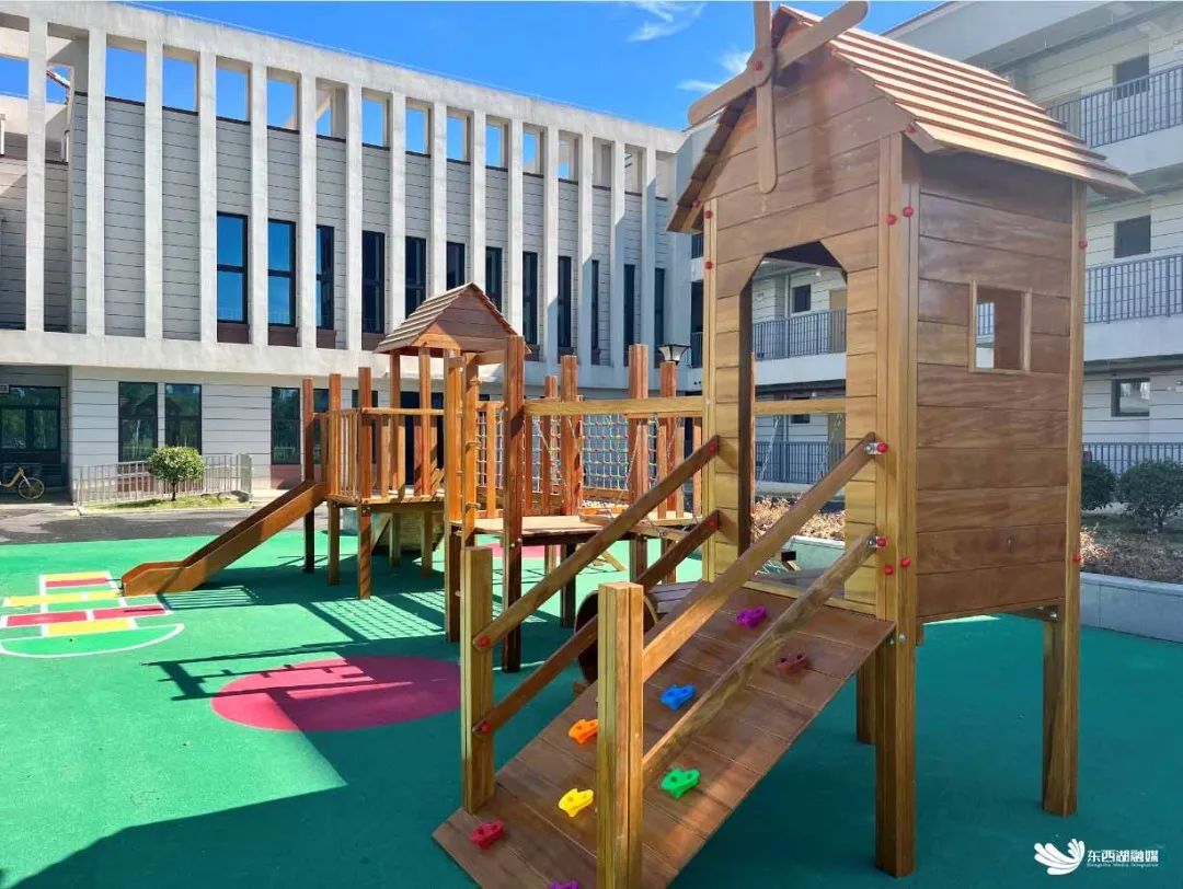 步入园区,仿佛置身一个天然游乐场,五彩缤纷的环绕形操场、木质攀爬架、滑梯等户外设施一应俱全。