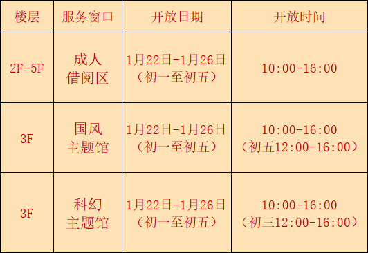 1月22日至26日(初一至初五)期间,10:00-16:00场馆免费开放;1月21日,1月27日(除夕、初六)闭馆。