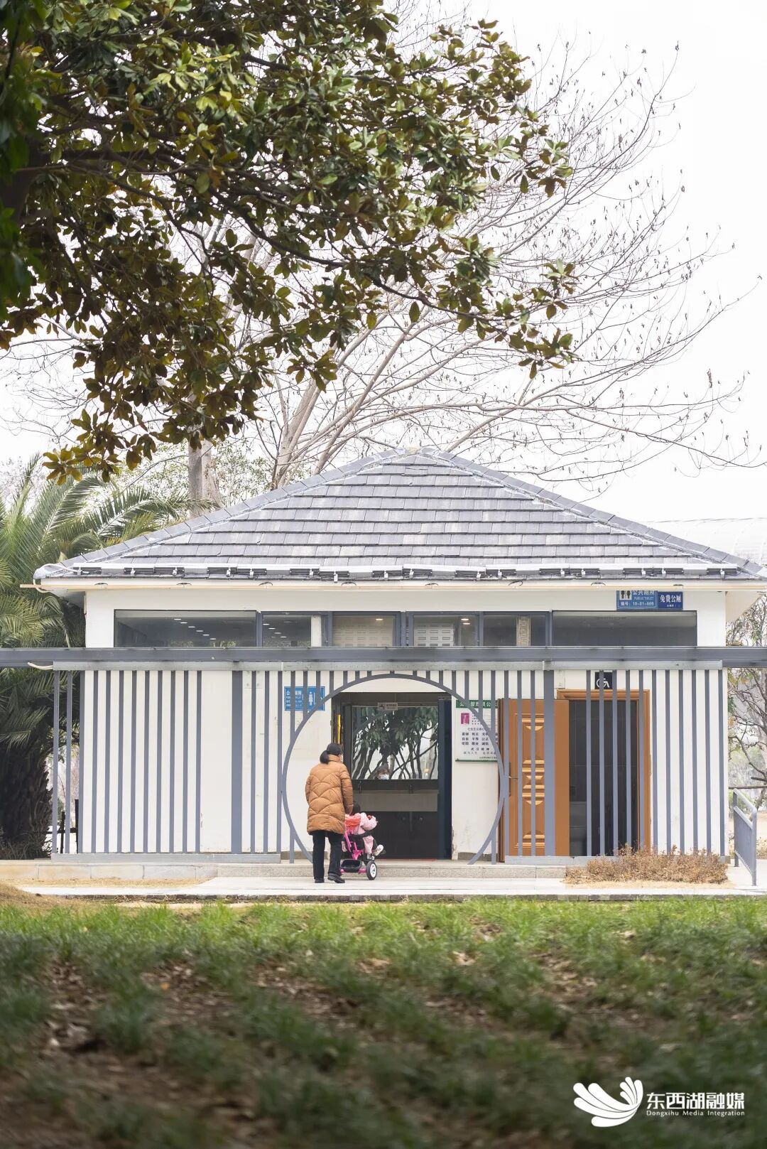 2月1日,记者先来到吴家山金山游园公厕,看到整个公厕外形设计和周围环境巧妙融合,如同“游园一小景”。