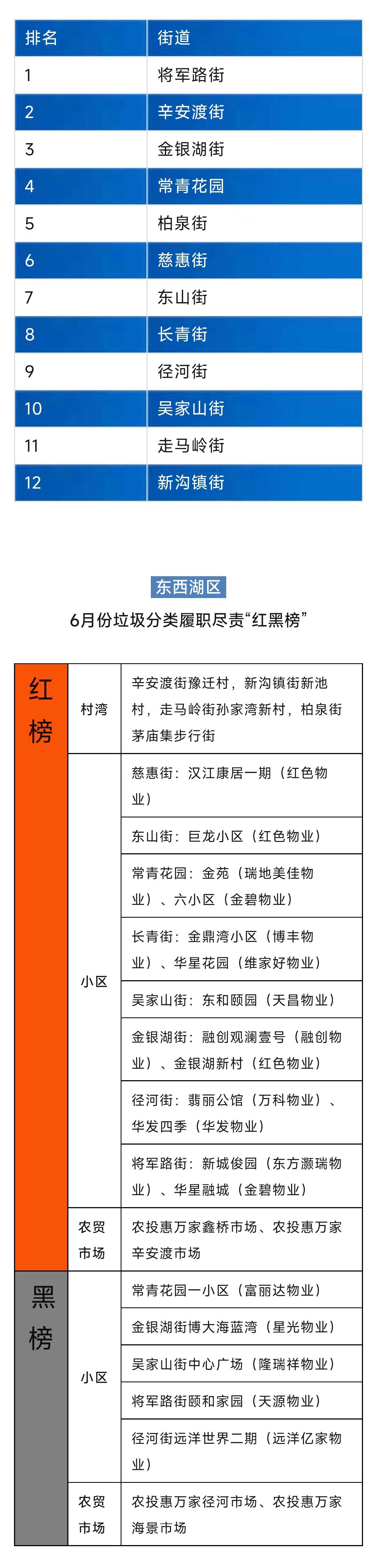 最新红黑榜,公布! 2023-07-18 14:52 东西湖区生活垃圾分类办 发布2023年6月全区各街道 生活垃圾分类工作考核排名 及履行生活垃圾分类管理责任红黑榜 6月各街道生活垃圾分类工作考核排名 ↓↓ 说明:红榜为履行生活垃圾分类管理责任较好;黑榜为拒不履行生活垃圾分类管理责任或履行责任较差。 (来源 - 东西湖区生活垃圾分类办) 分享到
